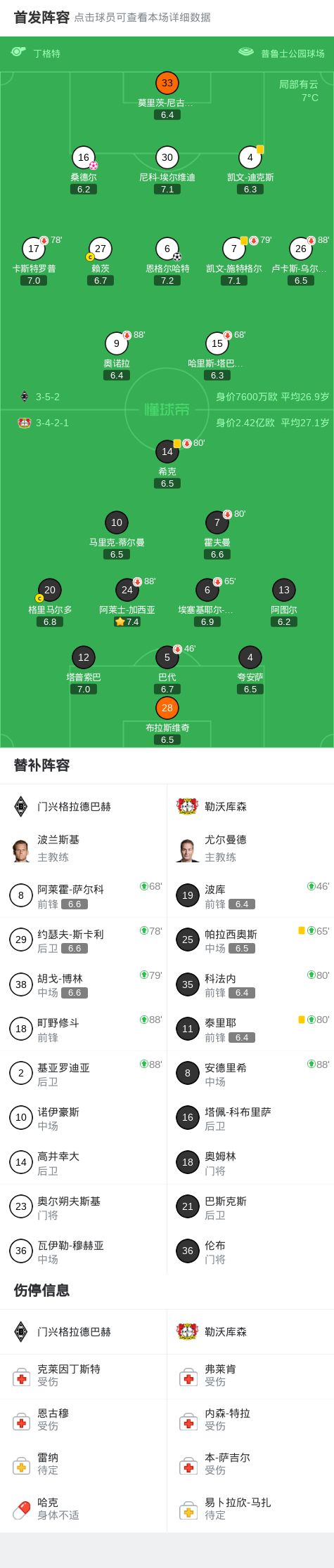 北京时间2月8日德国足球顶级联赛 联赛 第21轮,门兴格拉德巴赫主场对阵勒沃库森。门兴格拉德巴赫恩格尔哈特补射破门首开记录,加西亚射门造成桑德尔自摆乌龙。最终比分门兴格拉德巴赫 1-1 勒沃库森。
