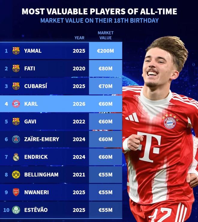 北京时间2月22日,在拜仁慕尼黑新星伦纳特-卡尔迎来18岁生日的情况下,德转统计出了18岁生日当天德转身价排名前10的球员,伦纳特-卡尔位列第四。
