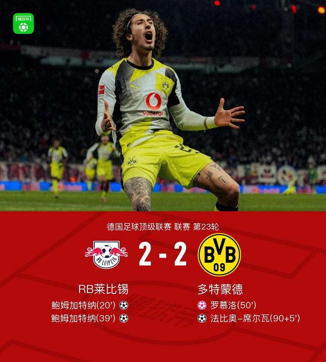 北京时间2月22日德国足球顶级联赛 联赛 第23轮,RB莱比锡主场对阵多特蒙德。上半场迪奥曼德晃动送助攻,鲍姆加特纳破门,之后劳姆传中,鲍姆加特纳破门完成双响。下半场罗慕洛头球自摆乌龙,补时阶段阿德耶米传中,法比奥-席尔瓦扳平。最终多特2-2战平莱比锡。
