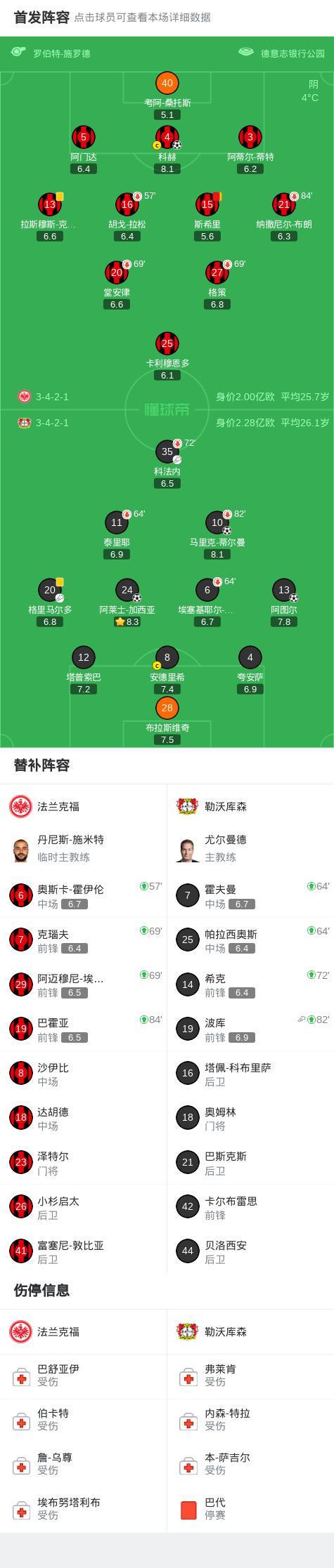 北京时间1月31日德国足球顶级联赛 联赛 第20轮,法兰克福主场对阵勒沃库森。法兰克福科赫破门。勒沃库森阿图尔破门,马里克-蒂尔曼破门,阿莱士-加西亚破门。最终比分法兰克福 1-3 勒沃库森。