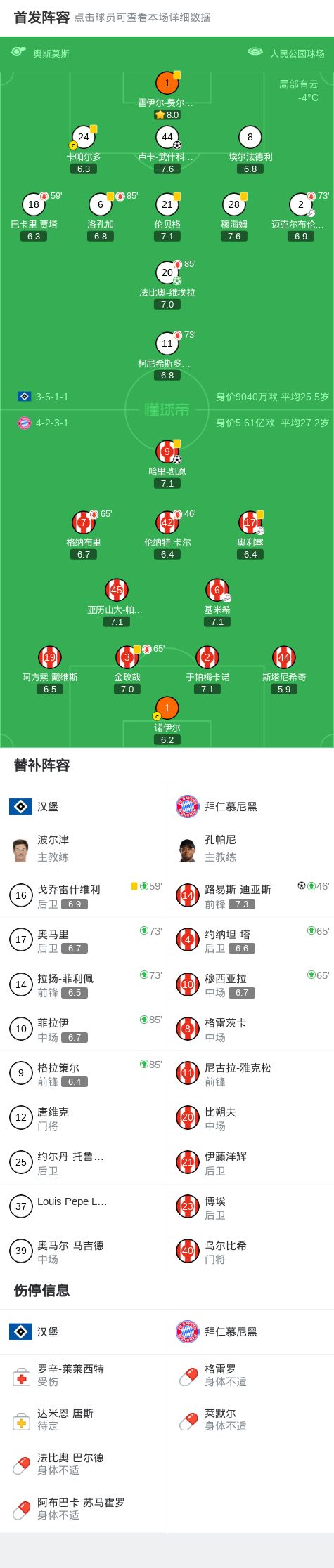 北京时间2月1日德国足球顶级联赛 联赛 第20轮,汉堡主场对阵拜仁慕尼黑。汉堡法比奥-维埃拉破门,卢卡-武什科维奇破门。拜仁慕尼黑哈里-凯恩破门,路易斯-迪亚斯破门。最终比分汉堡 2-2 拜仁。
