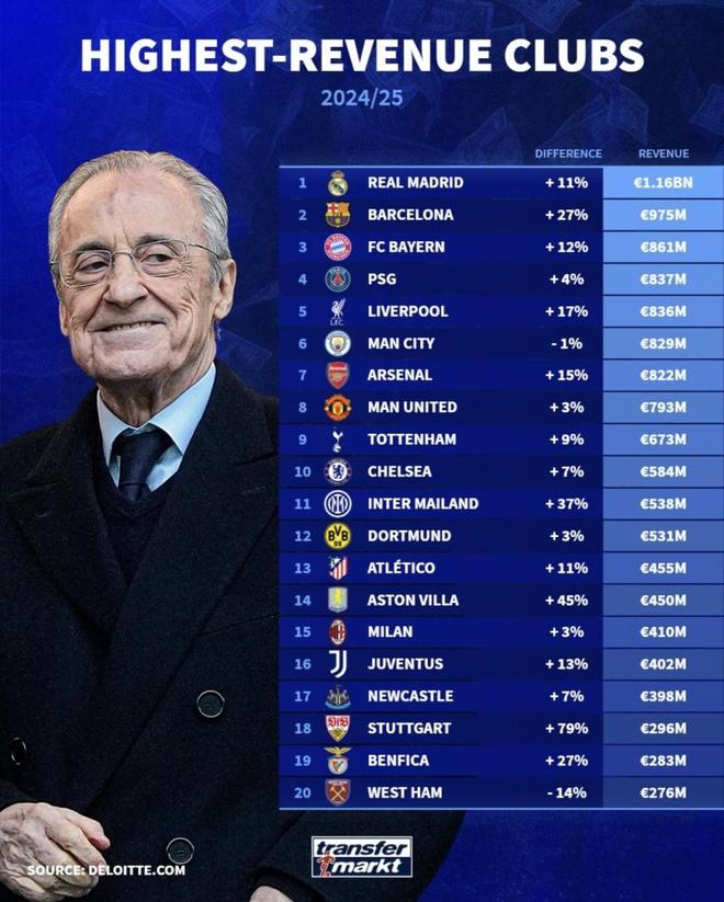 最近德国转会市场引用德勤的数据,发布了“2024/25赛季收入最高的俱乐部”排名:皇马以11.6亿欧元排第1,巴萨9.75亿欧元排第2,拜仁8.61亿欧元排第3,巴黎8.37亿欧元排第4;紧随其后的是利物浦第5、曼城第6、阿森纳第7、曼联第8。前几名把门槛抬得很高,但榜单真正的冲击点在于——同样是顶级豪门之间的较量,名次不只拼战绩,更拼俱乐部把“生意”做多大、做多稳。